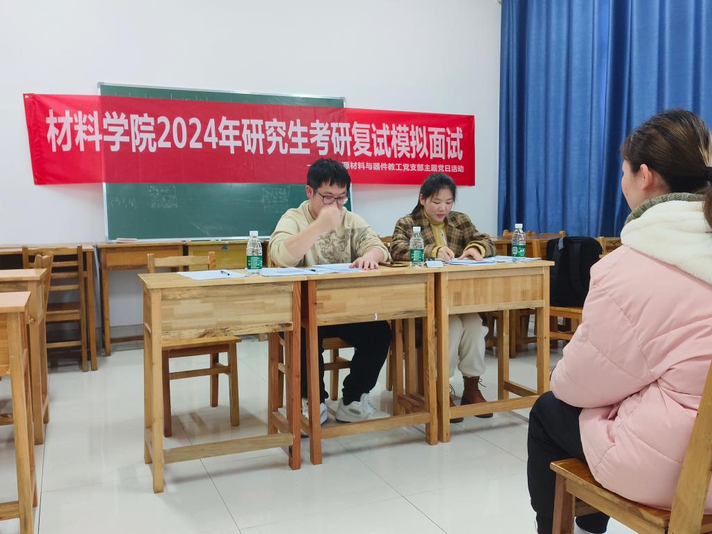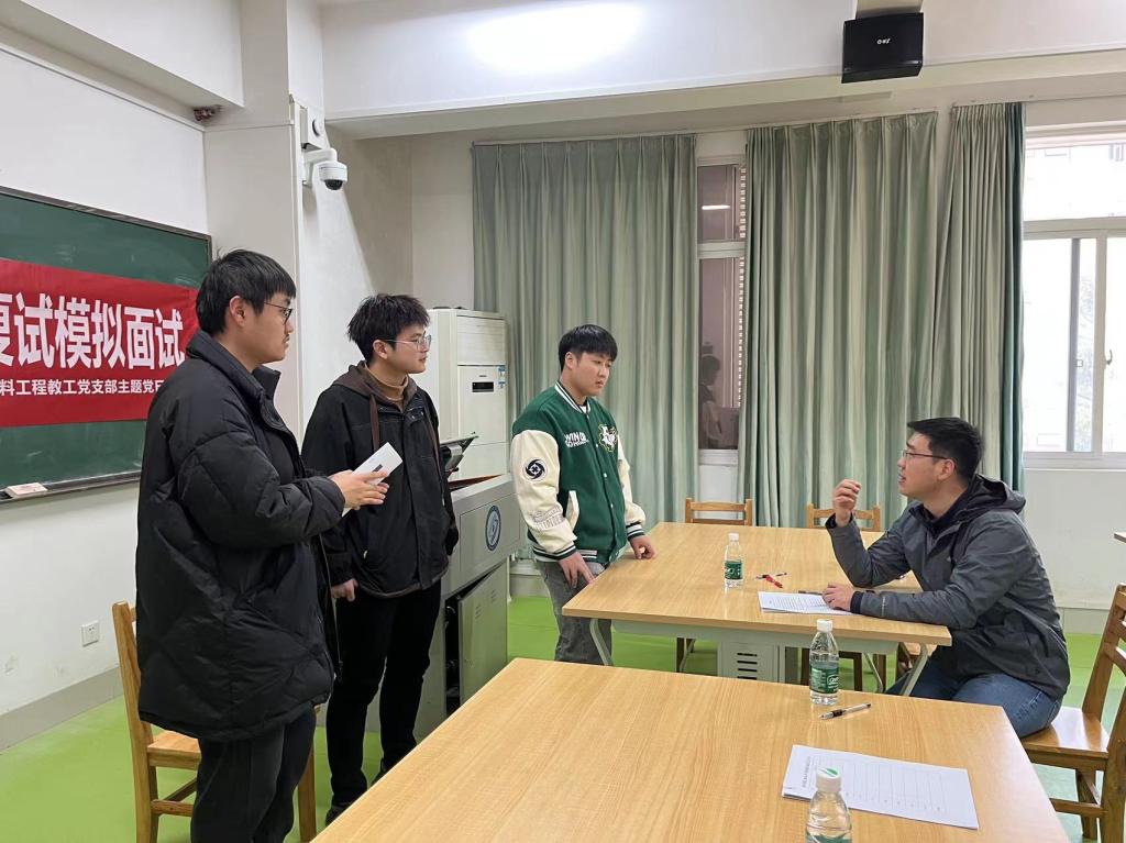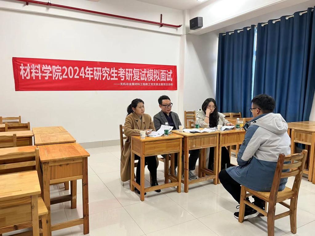 3月19日下午,材料学院2024年考研模拟面试在新能源1栋成功举办。来自无机非金属材料工程系、新能源材料与器件系的20余位专业老师主动请缨担任面试官,70余名考研学子参加,学生党建辅导员谭方林到现场组织协调。