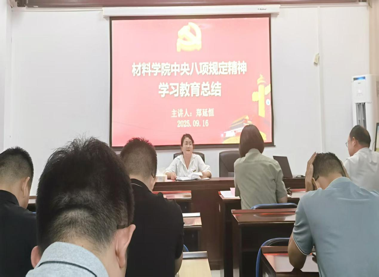9月16日下午,材料科学与工程学院在新能源1-908召开深入贯彻中央八项规定精神学习教育总结大会,全体院领导出席,全体教职工参加。会议由学院党委书记郑延恒主持