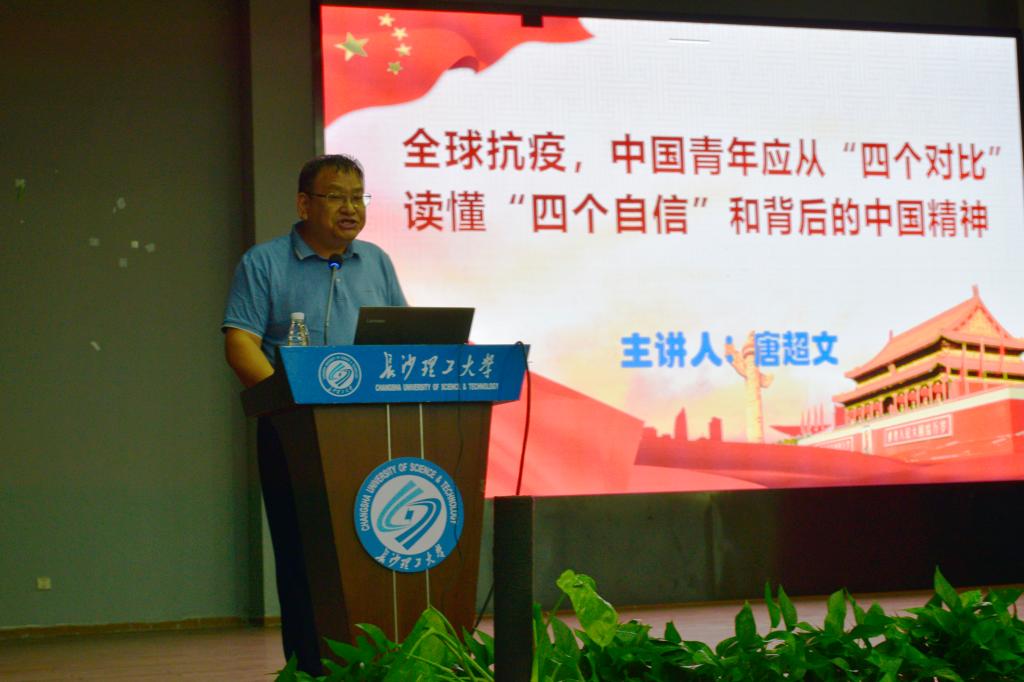 唐超文书记从五个方面进行了阐述,首先,我们要有“只有中国特色社会主义才能发展中国”的道路自信,我们坚持以人民为中心、坚持问题倒逼改革和坚持党是领导一切,我们的道路才能越走越宽广、越平坦和越坚定。其次,我们要有“新时代呼唤新思想,新思想引领新时代”的理论自信,从全球抗击新冠疫情的角度,我们的国家安全观越来越得到全国民众的支持拥戴,开放的发展理念越来越受到国际社会青睐,构建人类命运共同体的理念越来越得到各国政要认同。再次,我们要有“鞋子合不合脚,只有自己穿了才知道”的制度自信,我们能全民同心,群策群力,充分体现了我们的政治制度、组织体制和民主机制优势。与此同时,我们还要有“只有坚守中华文化立场,不忘本来、面向未来、吸收外来,才能屹立于世界之林”的文化自信,我们的文化源远流长、百经锤炼、兼容并蓄、百花齐放,值得自信。我们中国人民在抗击新冠疫情中产生的自强不息、愈挫愈勇的中国精神也让我们越来越自信。最后,唐超文书记向在场的全体同学们传达了学校第四次党代会精神,并勉励同学们要与时代共同前进,心怀崇高理想,爱国爱校并要付诸行动,为将350vip浦京集团官网建设成为“百强”大学而共同奋斗。
