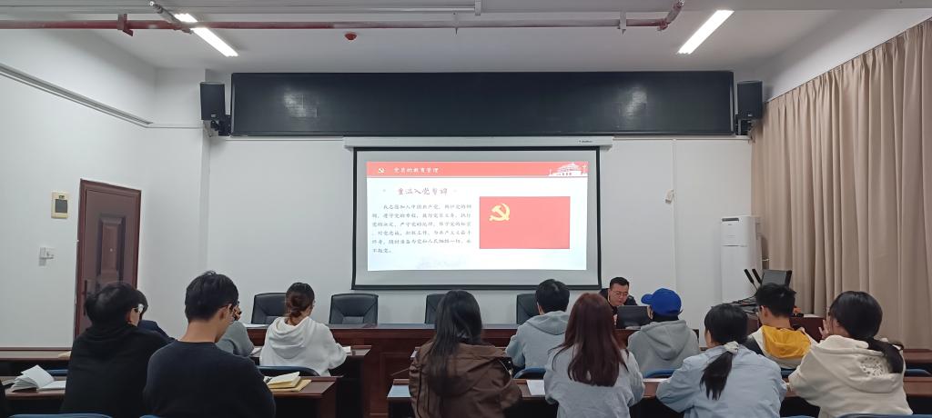 紧接着,党建辅导员谭方林讲授党课,就党员的教育管理展开论述。他表示作为学生党员,我们当学习贯彻习近平新时代中国特色社会主义思想,读原著、学原文、悟原理,努力做到学以致用、知行合一,练就过硬本领,明确身份意识。
