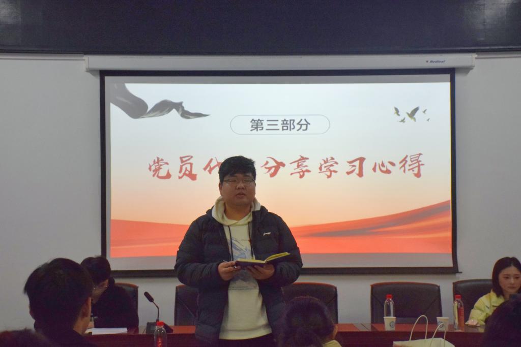 接下来,全体党员集中观看了党员专题教育片,该影片讲述了心有大我、至诚报国的教育家精神。自五四运动以来,教育家们在不同时代背景下教书育人,将马克思主义引入中国,结合中国实际加以宣传,深入人民心中,用自己的方式将其深刻的内涵精神继承下去,为党和国家培养了一系列人才。观影结束后,活动进入了讨论交流环节。李永康同志和袁馨怡同志作为代表发表了自己学习心得。他们认为,青年党员在时代发展中要守住自己的初心,将思想进行传承和发扬,并加以创新,贯彻自己心中的理想信念,发挥自身的先锋模范作用。