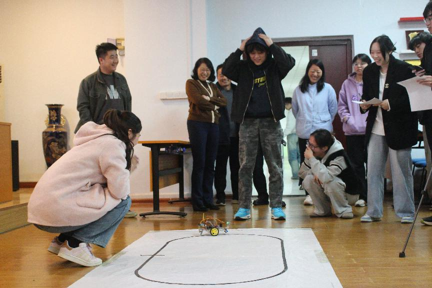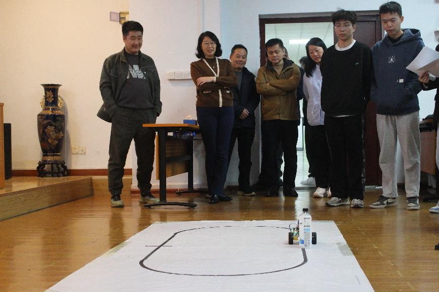 比赛当日,各参赛队伍精神饱满、同台竞技。学院党委书记施一满、副书记陶双、副院长朱广峰、贺晖、曹志明等领导莅临现场观看比赛,并与同学们进行深入交流。循迹避障小车在复杂赛道上精准完成路径识别、障碍规避等任务,展现出扎实的传感技术与控制算法应用能力;蓝牙遥控平衡小车则凭借稳定的自平衡性能、灵敏的遥控响应,赢得现场阵阵好评。裁判组围绕任务完成质量、系统稳定性、技术创新性等核心维度,进行公正严谨的评审,赛场氛围紧张而热烈。
