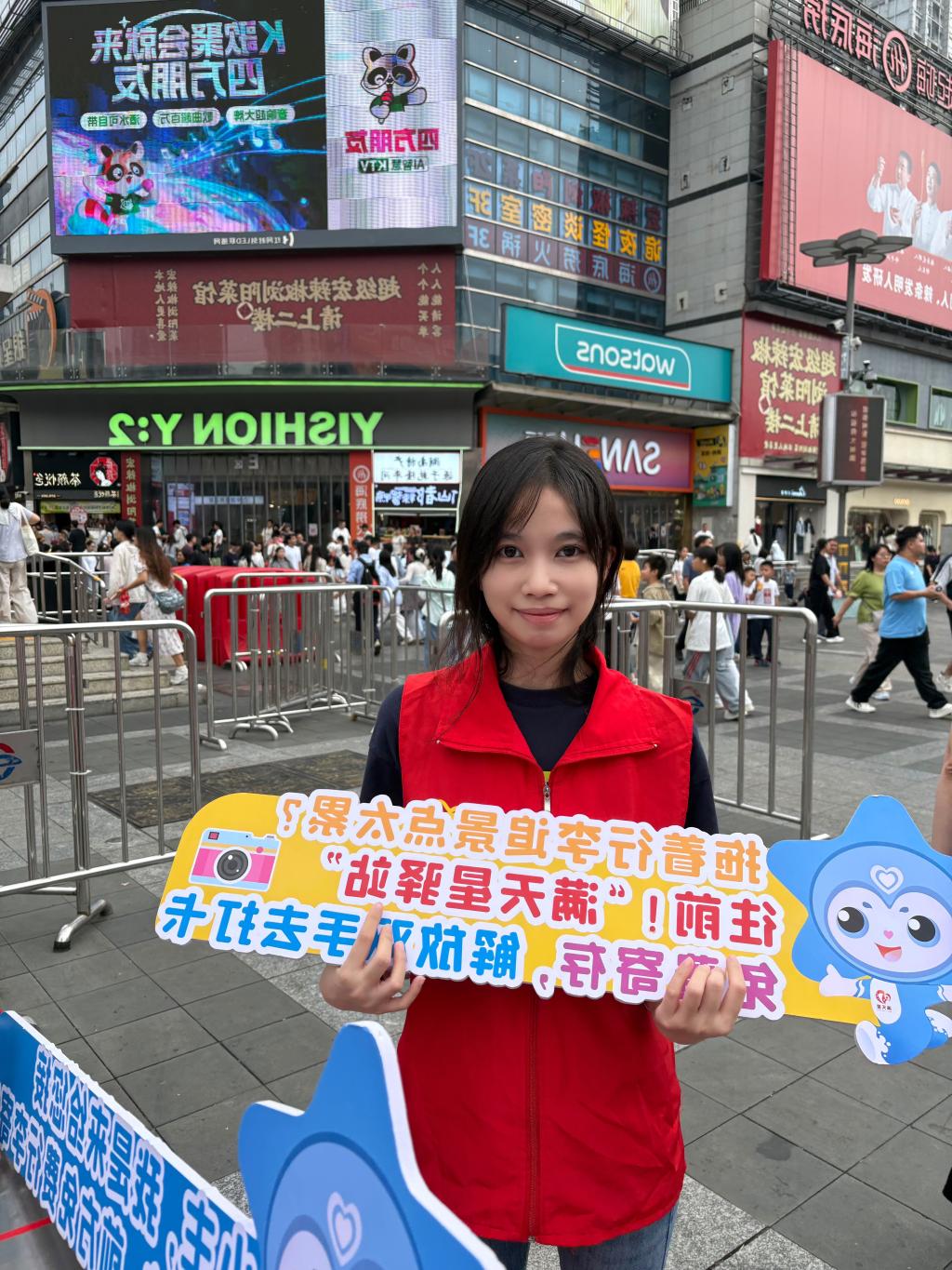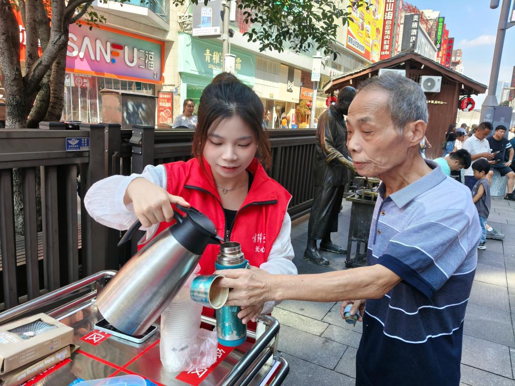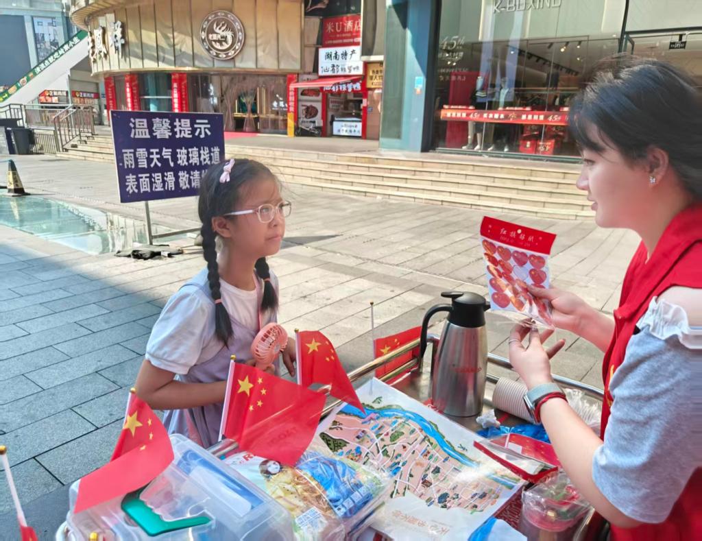 服务过程中,涌现出许多温暖瞬间:志愿者胡思琦细致维护商圈环境整洁,王音运用专业知识为游客处理伤口,王钰婷热情递上免费饮水,何鲁豫、傅晓等人则通过分发国旗,传递浓浓的爱国情怀。他们的真诚服务不仅缓解了黄金周期间商圈的接待压力,提升了游客的出行体验,更展现出城南学院学子良好的精神风貌与责任担当。