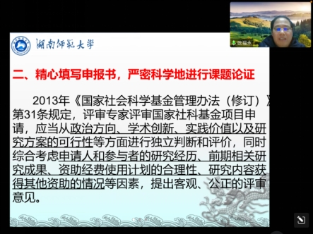 为提高科研项目申报质量,有效解决项目申报中的疑难和困惑切实做好国家社科基金项目申报工作111日晚7我院于线上组织召开了2023年度国家社科基金申报第五轮论证会议邀请湖南师范大学法学院副院长欧福永教授到会指导与交流欧教授主持了三项国家社科基金项目在国社科基金申报评审及组织管理等方面有着丰富经验法学院副院长徐莉申纯出席会议申报国家社科基金的法学院十余名教师参加会议由徐莉副院长主持
