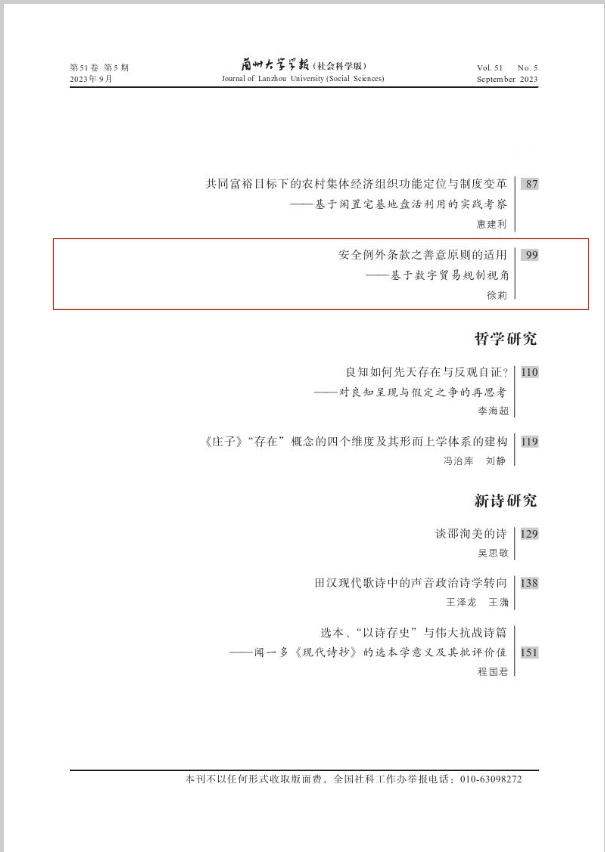 近日,350vip浦京集团官网法学院副教授徐莉在《兰州大学学报(社会科学版)》(CSSCI来源期刊)2023年第5期发表论文《安全例外条款之善意原则的适用——基于数字贸易规制视角》。