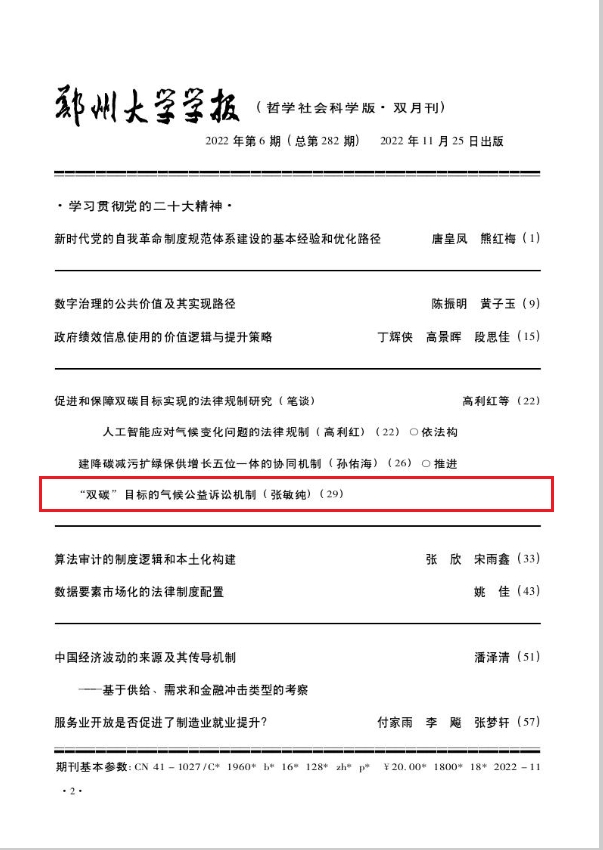 近日,350vip浦京集团官网法学院院长张敏纯在《郑州大学学报(哲学社会科学学报)》(CSSCI来源期刊)2022年第6期发表论文《推进“双碳”目标的气候公益诉讼机制》。