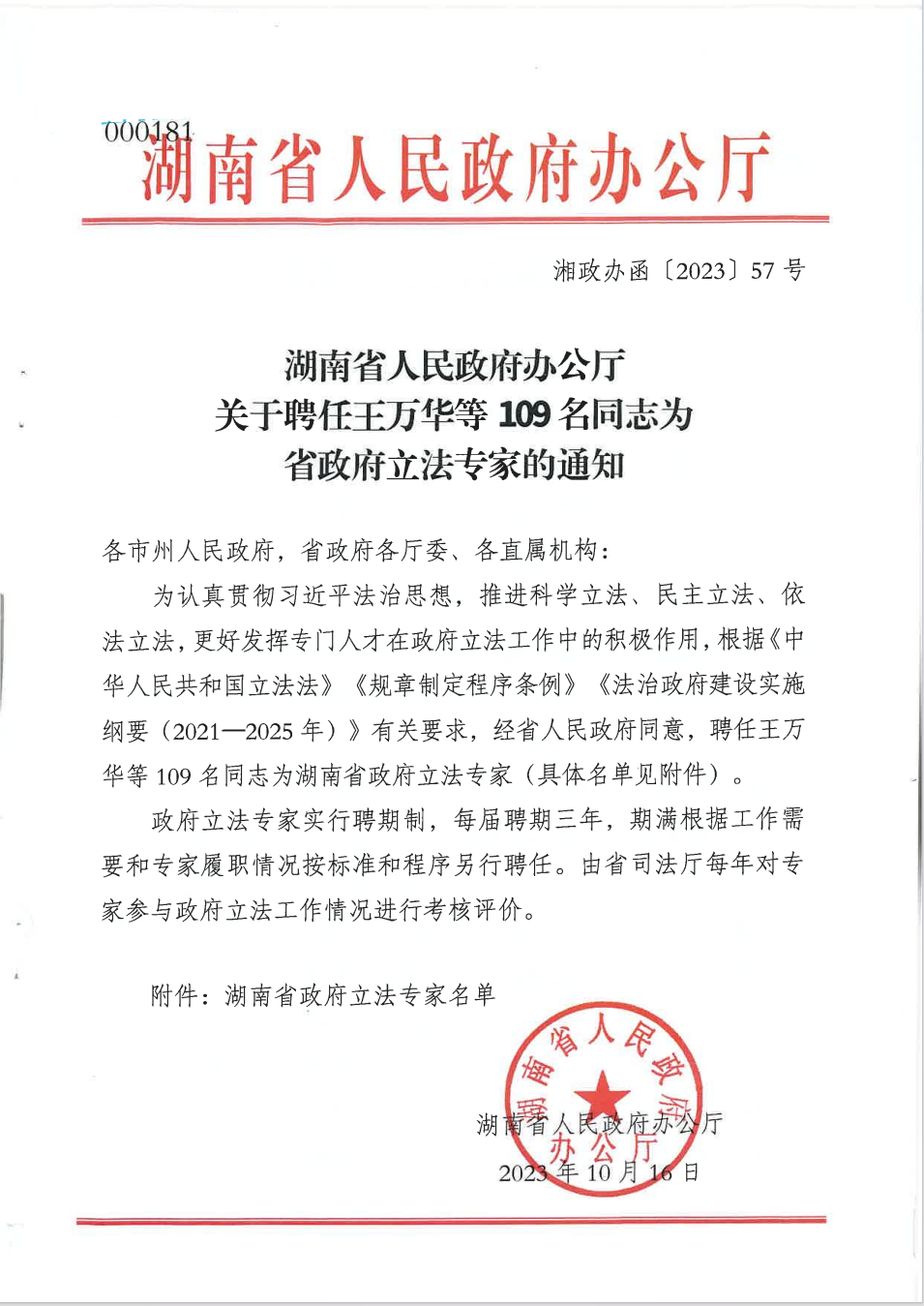 湖南省政府立法专家聘任名单共有109人,主要为法学、政治、社会等领域从事理论研究和实务工作的专业人士,实行聘任制,每届聘期三年,可以连续聘任。政府立法专家的职责主要包括:省人民政府年度立法计划编制提出意见建议;参与地方性法规、省政府规章草案的起草、调研以及省政府规章立法后评估;对地方性法规、省政府规章草案提出修改意见建议,以及对其他需要咨询论证的政府立法事务提出意见建议。