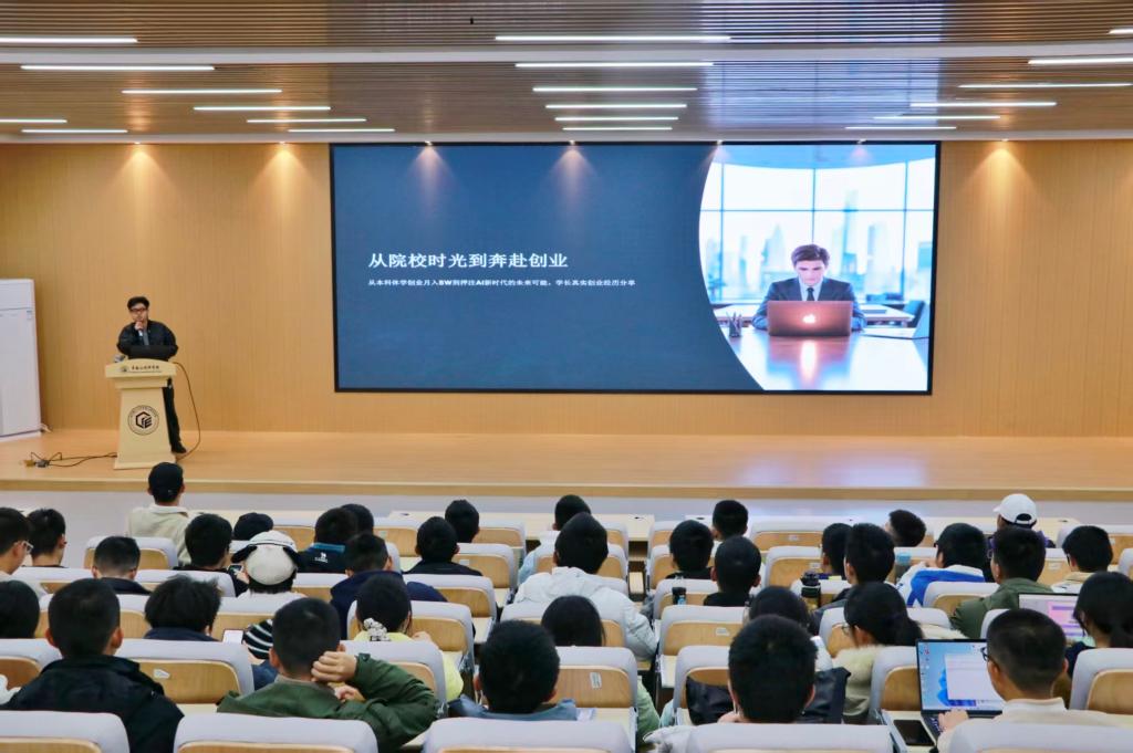 分享会上,邝烨庆以“从院校时光到奔赴创业”为主题,结合自身从本科休学创业到目前投身人工智能领域的经历,与在场师生进行分享。报告围绕三方面展开:一是运用“终局思维”进行大学规划与目标管理;二是基于“没有调查就没有发言权”等核心方法论,分析当前生产力发展新阶段下的社会与就业形势;三是探讨在新时代背景下,个人如何通过提升探索力与创造力,以适应市场需求并实现自身价值。