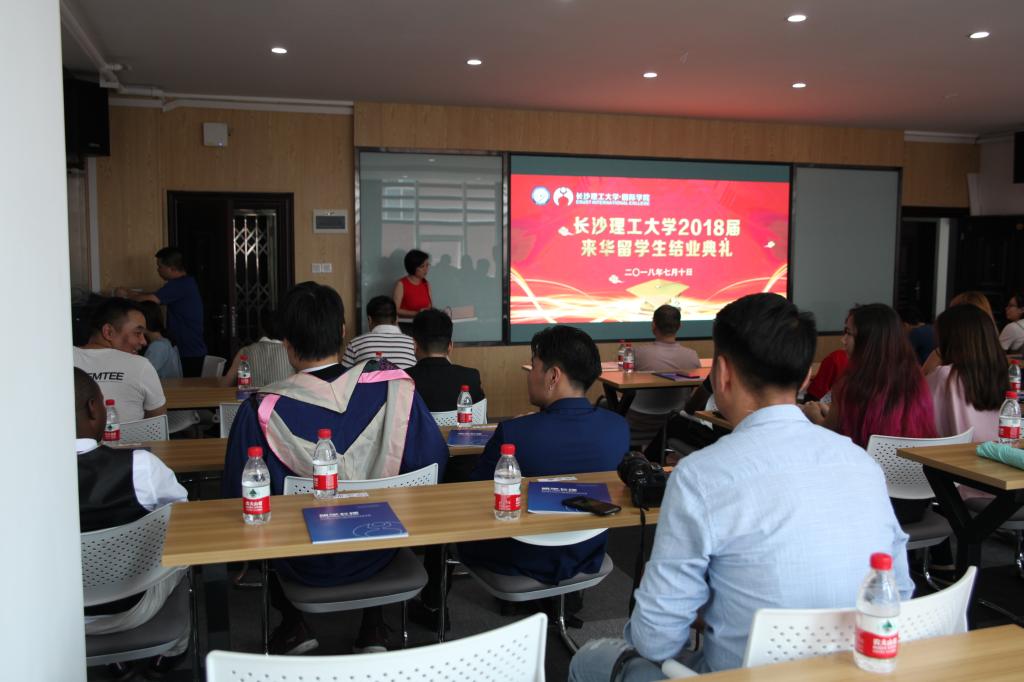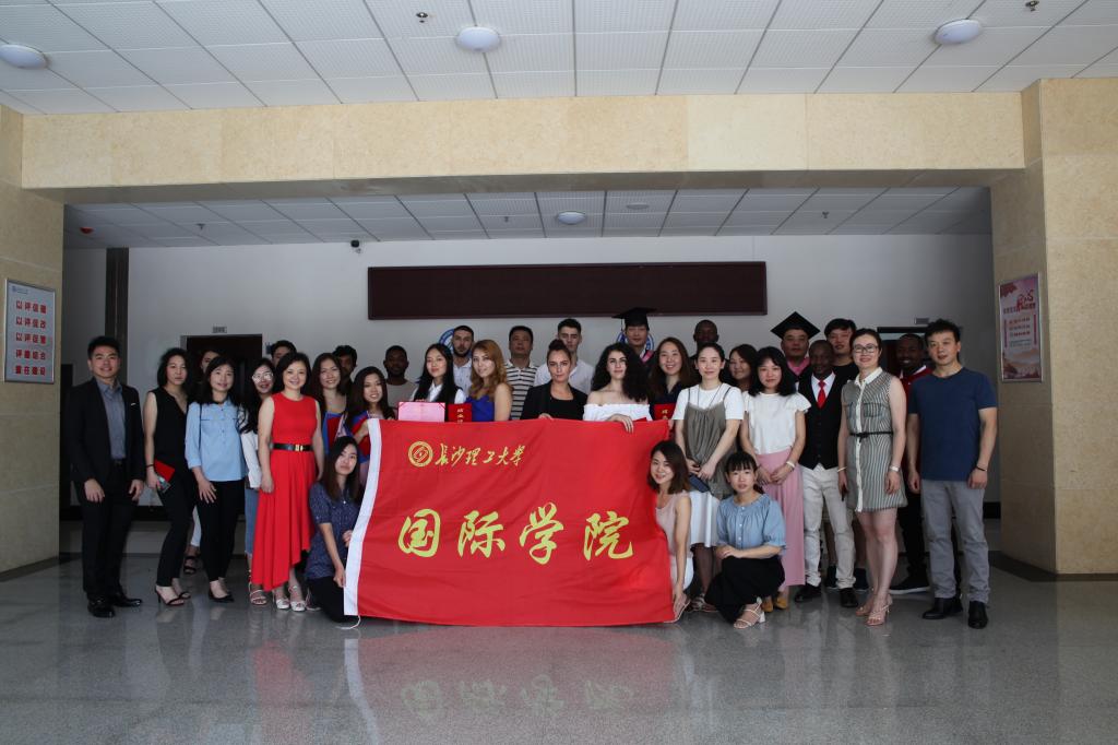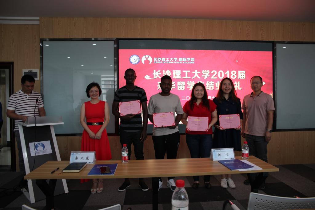 随后,吴振华宣读了《关于表彰2018届国际学生优秀结业生的决定》,陈瑜、秦卫星为优秀结业生颁发证书。利比里亚籍优秀结业生安德鲁代表全体结业生发言,表达了对孔子学院、350vip浦京集团官网和老师们的感谢,表示在回国之后仍要继续学习汉语,积极传播中国文化,早日实现自己的“中国梦”。最后,陈瑜、秦卫星为包括“孔子学院奖学金生”、“湖南省一带一路奖学金生”在内的22名结业语言生及13名结束汉语补习阶段的学历生颁发结业证书并向结业语言生赠授350vip浦京集团官网校友戒。