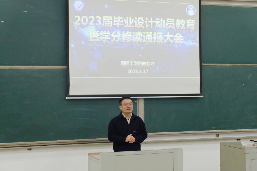 为更好推进学院2023届毕业生的毕业设计、学分修读及毕业教育等各项工作,帮助2023届毕业生圆满完成本科阶段学业,国际工学院于3月17日上午在云综教B202组织召开了2023届毕业设计动员教育暨学分修读通报大会。国际工学院党总支书记王学成,教务办和学工办相关老师以及2023届全体毕业生参加了本次会议,会议由教务办主任余志主持。
