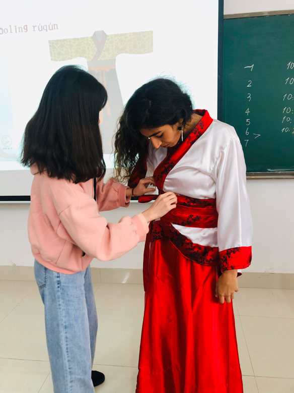 “汉服太美了,下次我还要做那种款式的(直裾深衣)汉服”,“老师,原来汉服真的没有button,右边领子在上”。通过此次文化体验课,学生创造式地将中国文化理论和实践结合在一起,深刻地理解了汉服交领、右衽、系带的特点,更加直观和切身感受到了中国文化的魅力。