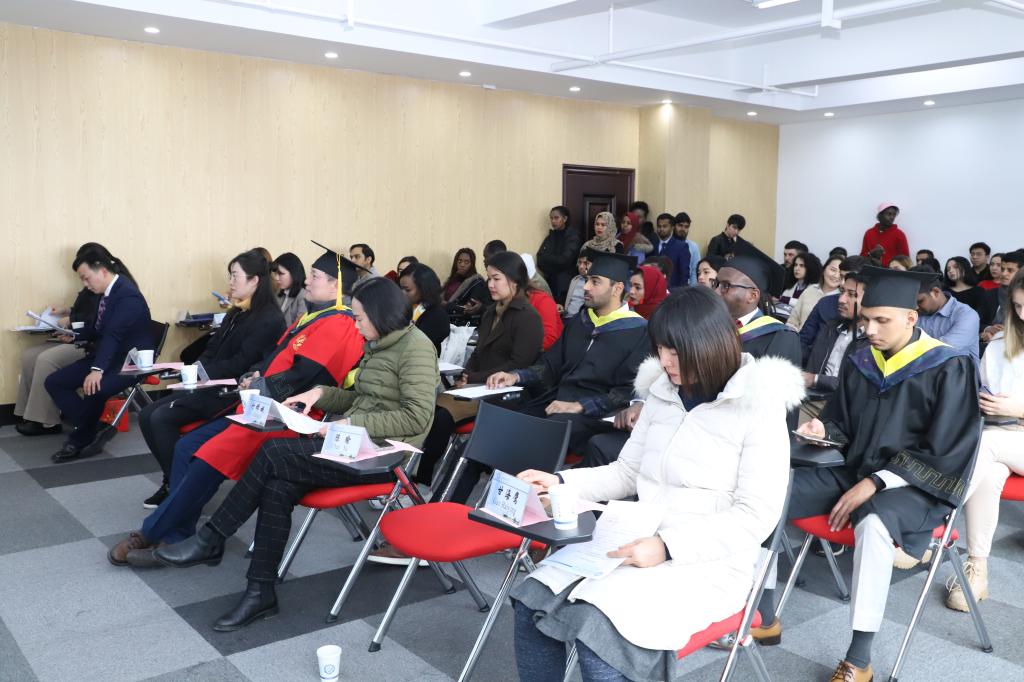 1月7日下午,浦京2020届(春)来华留学生毕(结)业典礼暨学位授予仪式在国际学院举行。校党委委员兼国际学院党总支书记付嫦娥、国际学院院长陈瑜、土木学院副院长肖勇刚、国际学院副院长甘海鹰、国际学院学习与发展中心负责人汤路,以及国际学生工作办公室全体老师出席了典礼。典礼由国际学生工作办公室负责人王荟惠主持。