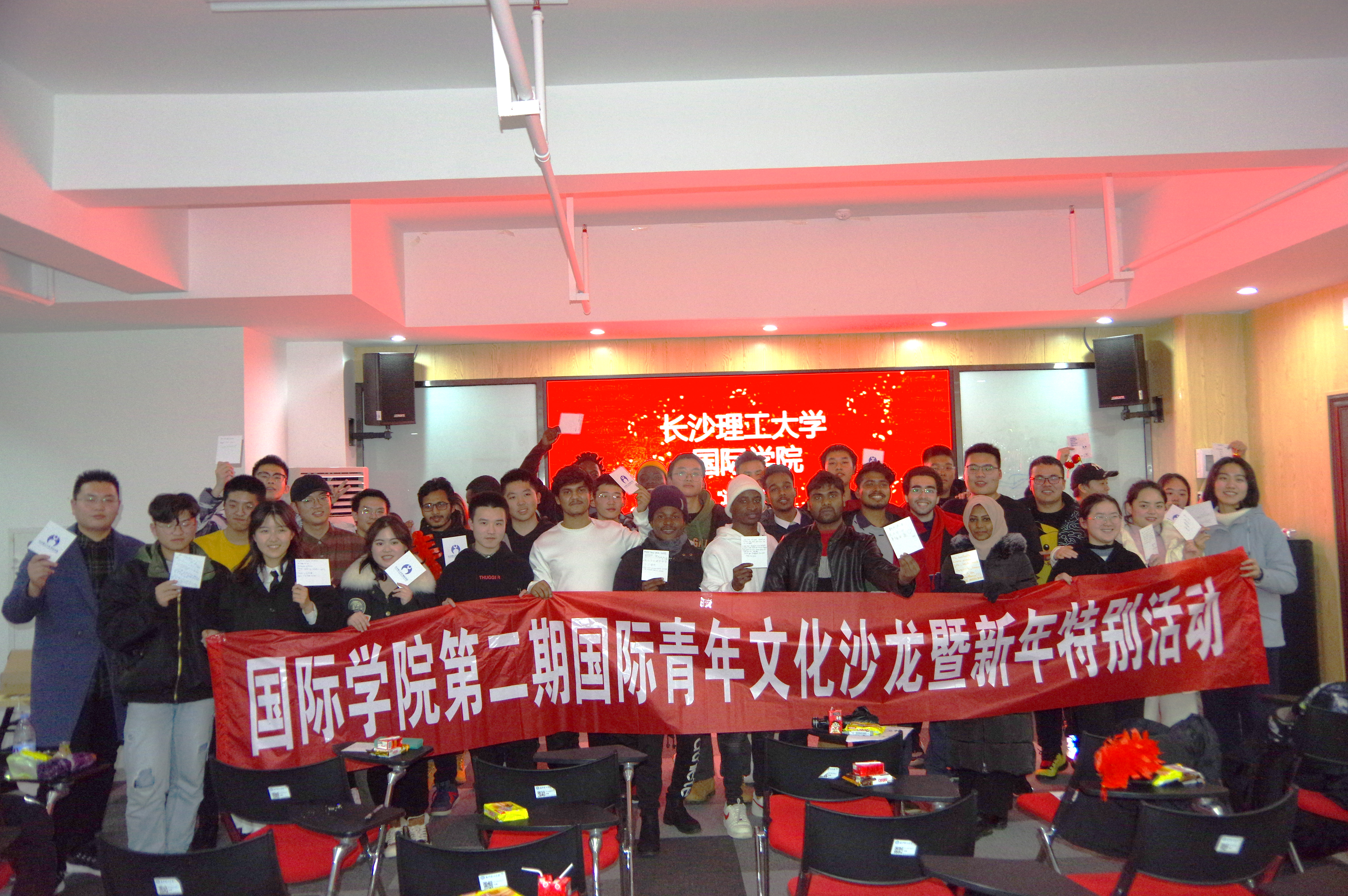 为呈现传统文化魅力,促进中外文化交流,国际学院12月29日组织举办了本学期第二次国际青年文化沙龙。我院来自孟加拉、老挝、尼泊尔、加纳、尼日利亚、布隆迪、卢旺达等国家的留学生和我院中国学生代表进行了以“迎新年、庆元旦”为主题的交流活动。
