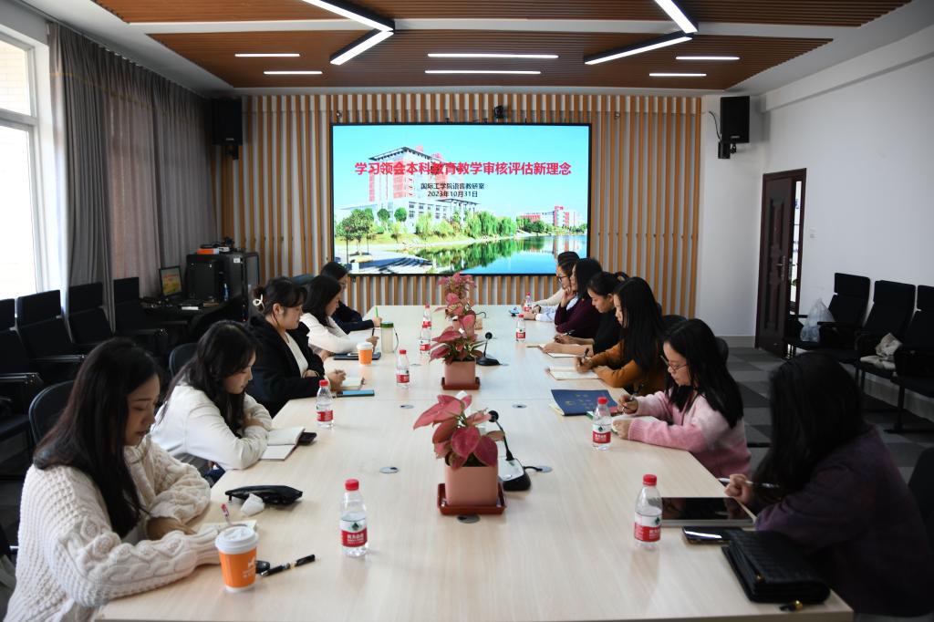 2023年10月31日下午3点,350vip浦京集团官网国际工学院语言教研室在新能源416室召开会议,学习领会本科教育教学审核评估新理念,以及讨论如何对课堂教学与相关材料进行整改。黄月华副院长、教务办余志主任及语言教研室全体教师参加了本次会议。