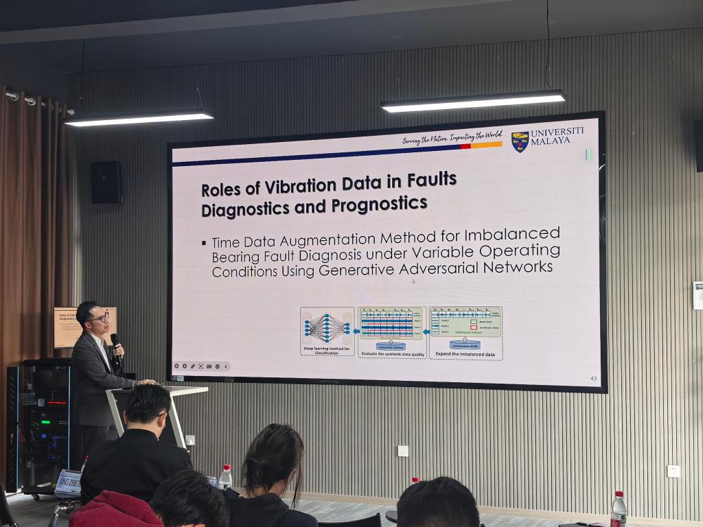 随后,由ONG ZHI CHAO副教授以“振动分析与状态监测的进展:探讨预测性维护和可持续性运营的新视角”为题作第二场讲座,介绍了团队研发的冲击同步模态分析(ISMA)技术,以及该技术在教学、科研及工业场景的成功应用,为设备“未病先防”的预测性维护提供了硬核支撑,最后他还向在场学生推介了马来亚大学针对浦京项目学生的研究生项目,鼓励大家前往马来亚大学深造。
