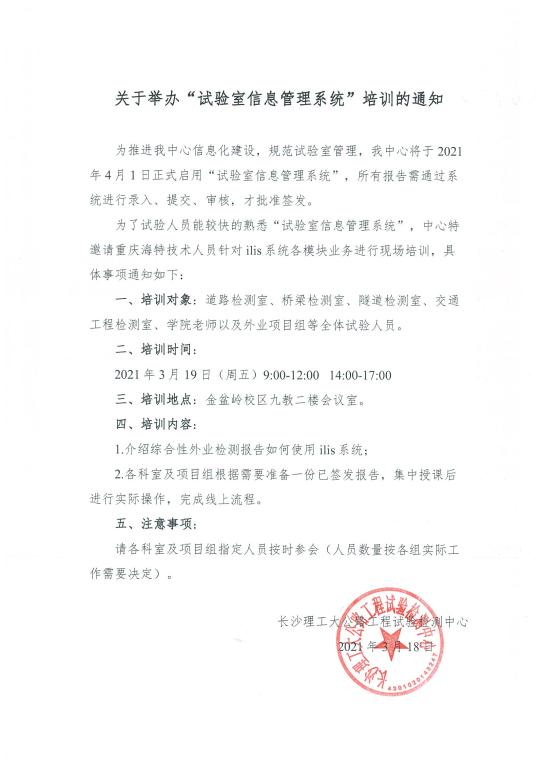 为全面提升中心试验检测人员技术水平,推动工地试验室建设管理标准化,做好工地试验室管理和试验检测工作,特举办此次培训。一、培训对象:技术负责人、工地试验室技术管理人员及其他相关人员。二、培训时间、形式:2021年5月20日(8:30-12:00、13:30-17:00)培训将采用网络直播课堂模式。三、培训地点:金盆岭校区9教三楼331会议室四、培训内容:1.工地试验室发展和历史沿革;2.工地试验室管理;3.工地试验室标准化;4.工...