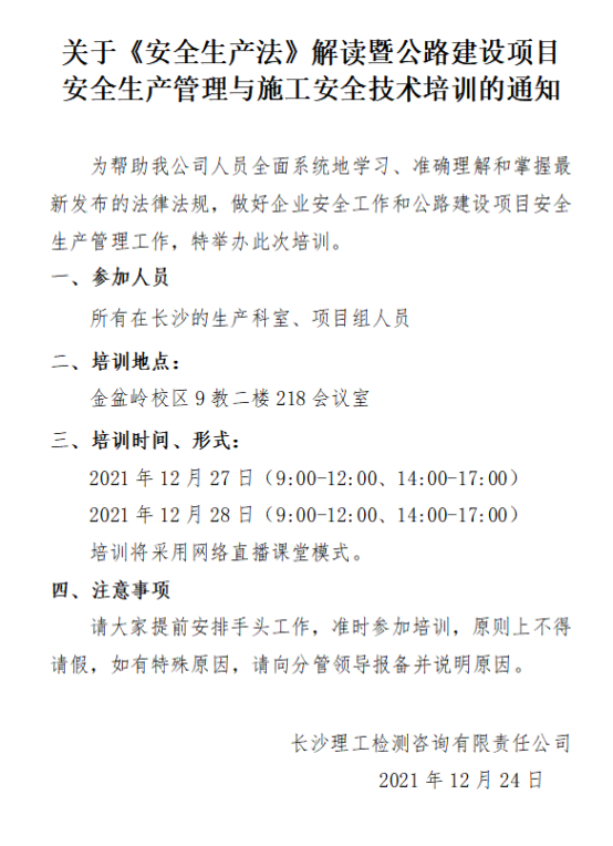 根据《2020年开展安全生产培训和检查的工作方案》要求,并结合公司实际,决定开展安全生产相关理论知识培训,现将培训有关事项通知如下:一、培训地点:金盆岭校区9教二楼218会议室二、培训时间:2020年6月18日(星期四)上午9点三、授课师资 刘山健(湖南省交通建设质量安全监督管理局副局长)四、参加人员公司全体人员五、注意事项请大家提前安排手头工作,提前十分钟进入会场签到,无特殊原因不得请假。 350vip浦京集团官网大公路...