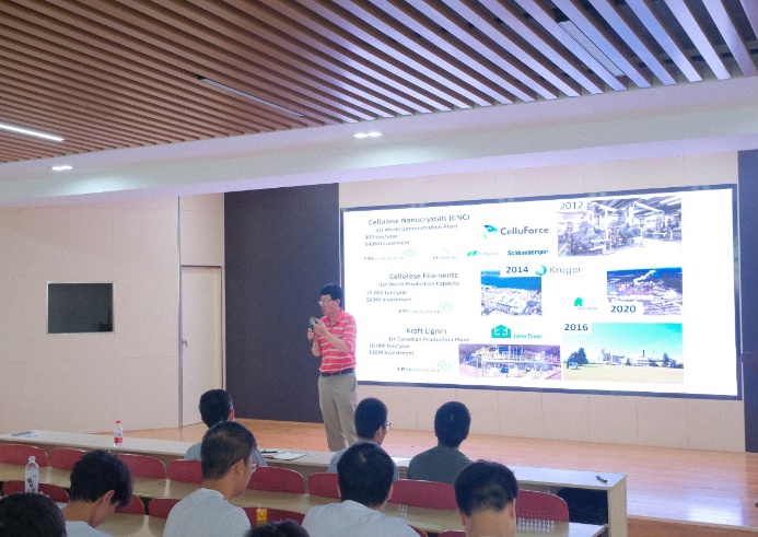 邹博士首先分享了自己在国内读书、读研和出国读博以及留在海外工作的经历,介绍了对自己专业和行业选择的认识,遇到的机会和付出努力,如何做到家庭、工作和个人梦想之间的平衡。鼓励在座青年大学生们要树立梦想和保持实现梦想的激情和动力,在人生的各个阶段难免会碰到的各种问题,要积极不断调整自己,勤奋努力迎难而上,适应不断变化的世界。关于轻工造纸行业的转型升级,他深入分析了当前在各种挑战和机遇下制浆造纸工业未来的发展,介绍了在传统纸浆产品基础上,基于植物生物质材料开发一系列包括生物柴油、木质纤维素基化学品、纳米纤维素等应用领域众多的新兴生物质产品,为同学们描画出一个美好的行业未来。
