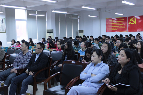 曹教授由一根头发丝的直径和一个乙醇分子的长度大小入手,循序渐进,生动形象地将微米纳米这一微观概念具体化、形象好。接着由浅入深,结合化学、生物、环境、食品、材料及工程方面的安全问题,介绍了纳米材料在化学/生物传感领域的研究进展与应用,并着重介绍了曹教授课题组近些年来在微纳生物传感检测领域展开的一系列科研工作,精辟地分析了微纳生物传感与安全检测领域正面临的机遇与挑战。最后,曹教授还将自己在日本留学期间积累的科研经验同大家分享,教导我们做学术要细心严谨、一丝不苟。曹教授通俗易懂的讲解方式、和蔼可亲的讲学风格、严谨治学的科研精神,让与会师生获益匪浅。