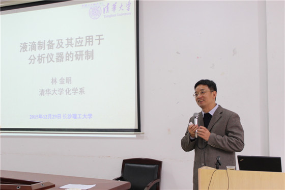 12月29日下午,应化学与生物工程学院邀请,国家杰出青年科学基金获得者、教育部“长江学者”特聘教授、清华大学化学系林金明教授来浦京讲学,在云塘校区工科三号楼A-320作了题为《液滴制备及其应用于分析仪器的研制》的学术报告。学术报告会由院长杨荣华教授主持,副院长曹忠教授、朱志平教授,以及化学与食品相关学科的教师和研究生、应用化学专业本科生100余人聆听了林教授的精彩报告。