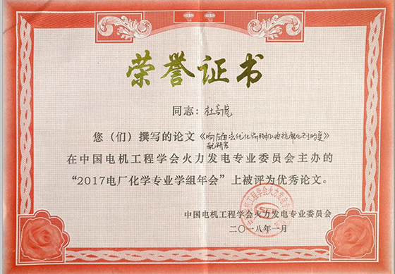 《电厂化学2017学术年会》录用60篇,出版论文集1部,350vip浦京集团官网有4篇论文被评选为大会优秀论文,即《响应面法优化涡轮机油抗氧化剂的复配研究》(作者:杜高宽)(指导教师:汪红梅副教授);《阴树脂粉末对换流站铝合金的腐蚀影响》(作者:杨磊)、《复合胺(ETA+DDA)工况对树脂循环污染的影响研究》(作者:张俞)、《脱销过程中尿素水解产物对水冷壁管的腐蚀研究》(作者:田龙标)。