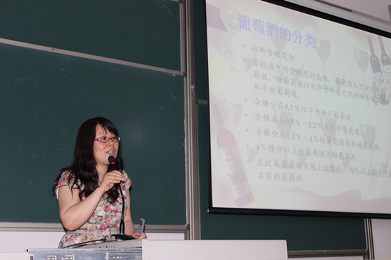蒋雪薇博士长期从事工业微生物发酵工程及食品生物技术方面的研究,并在这一领域取得了丰硕的研究成果。本次报告会上蒋博士自广大师生感兴趣的葡萄酒的品鉴入手,分别介绍了葡萄酒的分类、酿造过程、储藏、欣赏、饮用方法与配餐以及精品红酒及酒标欣赏等方面的内容。蒋博士结合自己的研究成果和求学经历,其通俗易懂、深入浅出、和蔼可亲的讲解方式,生动阐述了关于葡萄酒品鉴的有关知识。