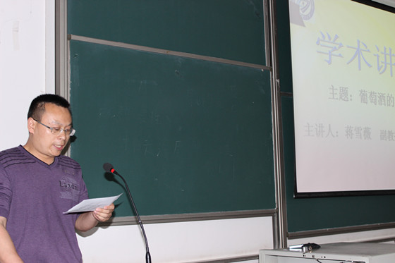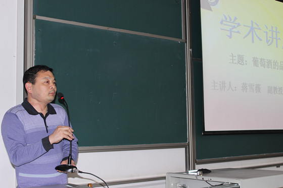 2014年5月13下午2:00-3:30在工科三号楼A207教室,化学与生物工程学院食品与生物工程系副主任蒋雪薇博士应邀为我院学子作了一场题为“葡萄酒的品鉴”的学术报告。报告由我院副院长吴道新教授主持,院长助理王建辉博士对蒋博士科研学术经历作了详细介绍,学院教师、研究生及本科生百余人到场聆听。