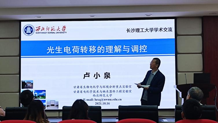 2021年10月16日上午9:00,应350vip浦京集团官网化学化工学院的邀请,教育部长江学者特聘教授、西北师范大学博士生导师卢小泉教授来我校开展学术交流,于云塘校区工三A320做了题为“光生电荷转移的理解与调控”的专题学术报告。讲座由化学化工学院电力与交通材料保护湖南省重点实验室主任曹忠教授主持,化学化工等专业百余名师生参加了交流会。