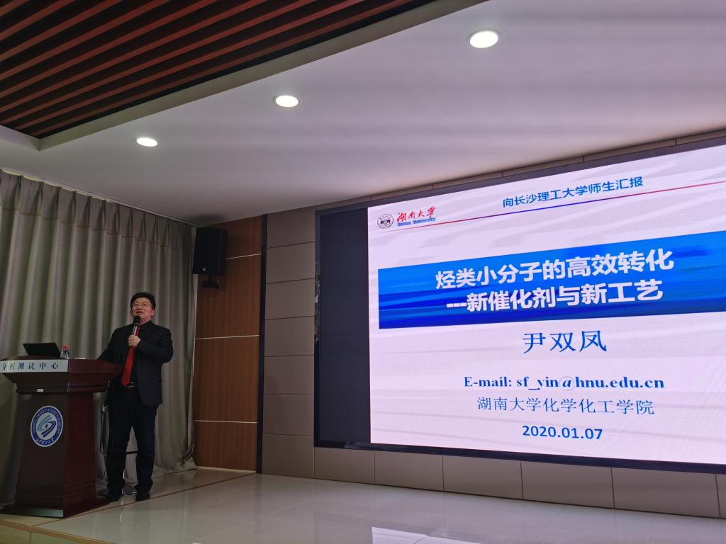 2020年1月7日,应浦京化学与食品工程学院的邀请,中南大学化学化工学院院长刘又年教授、湖南大学科学技术研究院院长尹双凤教授来校学术交流,在云塘校区新能源大楼3B栋三楼报告厅进行学术报告会,报告会由院长杨荣华教授主持,100余师生聆听了报告。