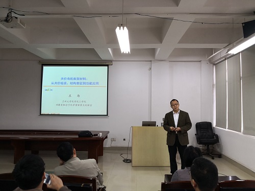 11月8日上午,国家杰出青年科学基金获得者、教育部“长江学者”特聘教授、兰州大学功能有机分子化学国家重点实验室主任王为教授应邀来浦京进行学术交流。在云塘校区工科三号楼A320会议室,王为教授以“共价有机框架材料:从共价组装、结构表征到功能应用”为题,给大家带来了一场学术盛宴。学术报告会由化学与生物工程学院院长杨荣华教授主持,副院长曹忠教授、副院长朱志平教授、副院长张跃飞教授及化学、化工、食品等相关学科的老师、研究生及本科生100余人参加了学术报告会。