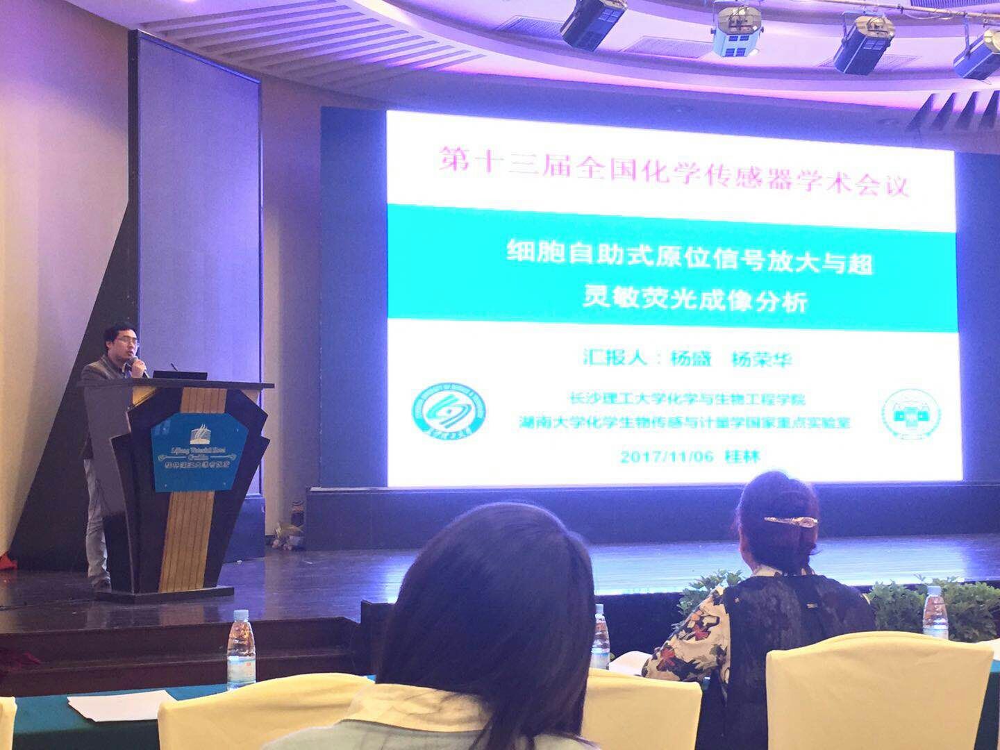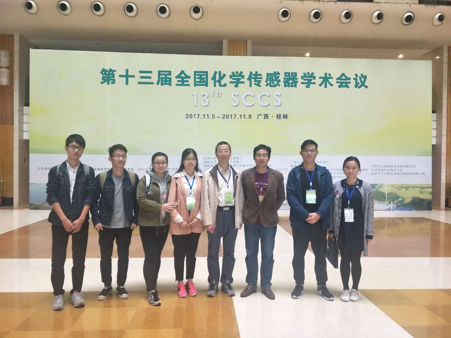 2017年11月5-8日,第十三届全国化学传感器学术会议(13th SCCS)在广西桂林召开,本次会议由中国仪器仪表学会分析仪器分会化学传感器专业委员会主办,桂林电子科技大学承办,湖南大学化学生物传感与计量学国家重点实验室、西南大学纳米材料及传感技术重庆市工程实验室、上海师范大学、江苏电分析仪器有限公司、广西师范大学和桂林理工大学等共同协办。本次会议旨在促进化学与生物传感器的学术交流与发展。浦京化学与生物工程学院副院长曹忠教授、杨盛博士及研究生一行八人出席了本次会议。