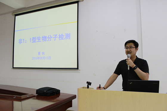 随后,4:00-5:30,夏帆教授在工三A-320会议室开展了题为《非1:1型生物分子检测》的学术报告。报告会由副院长曹忠教授主持,曹院长简要介绍了夏教授在生物分子检测领域所取得的重要成就。院长杨荣华教授及来自湖南大学、湘潭大学、350vip浦京集团官网的化学、化工等相关学科的青年教师、研究生及本科生100余人参加了此次学术交流活动。夏教授首先阐明生物分子的高灵敏度检测对疾病早期发现和早期识别的重要意义,指出传统1:1型检测仍然难以解决目前生物分子检测领域的挑战,接着介绍其课题组基于核酸探针设计非1:1型检测,大大提高了检测方法的灵敏度和特异性。夏教授详细介绍了如何通过多个靶标分子与多个信号探针有序结合,实现信号线性级联放大,从而达到检测灵敏度和特异性的同时提升;同时,夏教授以膀胱癌为例子,生动地讲述了根据DNA杂交、利用生物探针对靶细胞进行检测,最终实现对病理细胞的治疗。此次夏教授的讲座加深了老师与老师、老师与同学之间的学术交流,使他们对生物分子检测领域有了更进一步的了解,为大家提供了一个良好的学术交流平台,开阔了大家的视野,为今后的科研工作拓宽了思路。