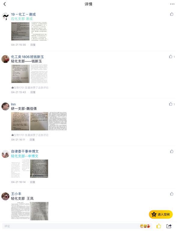 围绕人民英雄纪念碑之致敬先烈,追思与铭记为共和国的成立、建设和改革事业作出奉献和牺牲的先烈们等视频资料进行学习。资料生动阐述了人民英雄纪念碑创作过程的艰难,表达了全国各族人民敬重人民英雄的共情,并在英雄精神的激励下争做新时代英雄,为中国特色社会主义建设添砖加瓦。深入学习后大家进行了热烈的线上讨论交流。食品支部贺璇兮认为,“英雄应该是忠诚的,他们对党和人民的伟大事业矢志不渝,坚守住自己的初心,为人民谋幸福,为民族谋复兴。英雄应该是执着的,他们敢啃别人不敢啃的硬骨头,愿意几十年如一日地埋头苦干,对事业的坚守无怨无悔。”化工支部彭佩立表示,“死亡不是生命的终点,遗忘才是永恒的消亡,而人民英雄纪念碑便是党和国家对人民英雄的恭肃与谦敬,是对人民英雄永恒的追思与铭记。”环工支部朱映铭谈到,“英雄见于伟大品格,伟大成于平凡事业,伟业需要接续奋斗。作为新时代青年,我们更应该继承革命先辈的光荣传统,学习他们的无畏牺牲和奉献精神,勇担青年一代的历史重任,为实现中华民族伟大复兴的中国梦不懈奋斗”。