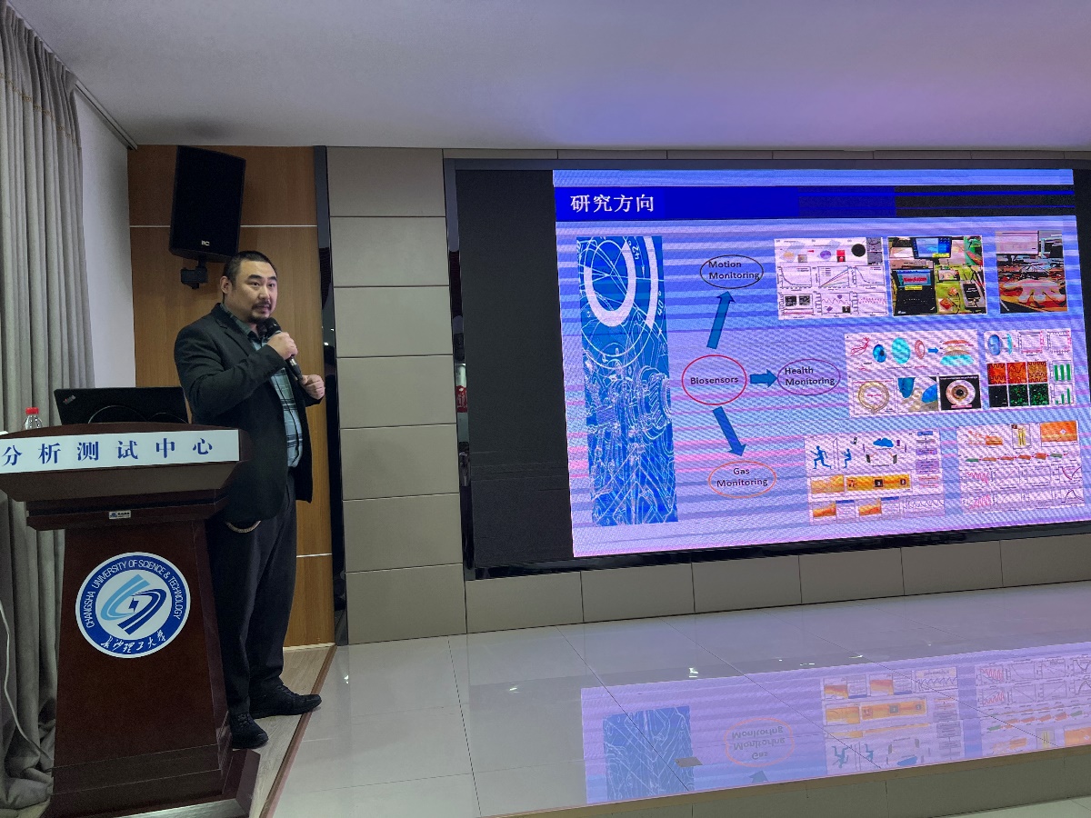 张晟教授首先介绍了团队的主要研究工作,重点介绍了智能隐形眼镜的研发,不仅能实现24小时不间断检测血糖,而且对人体无害,是一种理想的可穿戴血糖仪。新型隐形眼镜生物传感器系统包含3个探测器,分别是用于接收光学信息的光电探测器、用于诊断潜在角膜疾病的温度传感器和用于直接监测泪液中葡萄糖水平的葡萄糖传感器。与传统的传感器和夹在透镜基板中的电路芯片不同,特殊设计的蛇形网状传感器系统可以直接安装在透镜上并与泪液保持直接接触,从而提供高检测灵敏度,同时机械坚固且不会干扰眨眼或视力。此外,智能隐形眼镜的体外细胞毒性测试显示出良好的生物相容性,戴上之后不会有异物感,这一特性使它有望成为医疗保健和医疗应用的下一代软电子产品。此外,张晟教授团队研究开发出了一种基于超大二硒化钼纳米薄片的轻巧、廉价的表皮气体传感器。二硒化钼纳米薄片在催化、储能、电子器件等领域有着广泛应用,基于二硒化钼纳米薄片研制出的可集成到人体皮肤上的高性能环境传感器,拥有较高的稳定性和拉伸应变性能。