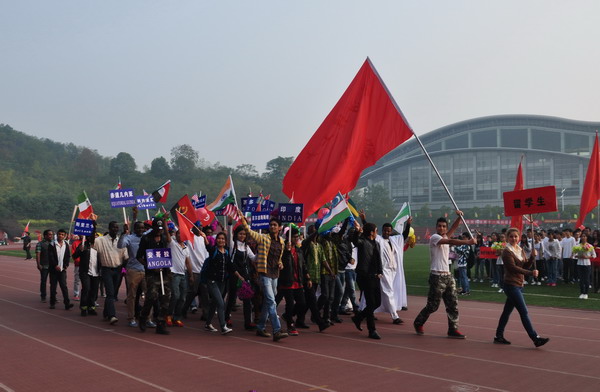 The Sixth CSUST Sports Culture Festival & the Eleventh CSUST Track and Field Sports Meet opened on October 25th in Yuntang campus. Sixty-four international students from 18 countries, including Angola, Bahamas, Pakistan, Equatorial Guinea, Togo, Russia and Sri Lanka, attended the opening ceremony with their national flags in a neat and orderly manner.