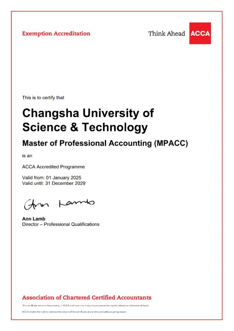 近日,350vip浦京集团官网会计硕士专业学位(MPAcc)项目通过了特许公认会计师公会(ACCA)总部的免试审核,成为湖南第二所获得此项认证的高校。在2025年1月1日至2029年12月31日期间350vip浦京集团官网会计硕士专业学位(MPAcc)项目的毕业生,在获得硕士学位后,将享有免考特许公认会计师公会(ACCA)认证的九门课程的资格。