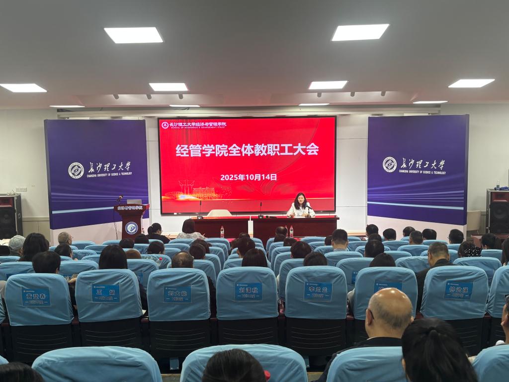 10月14日下午,经管学院在金盆岭校区12教200报告厅召开2025年秋季学期教职工大会,全面总结前一阶段工作情况,安排部署本学期各项重点工作。会议由院党委书记马丽主持。