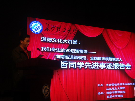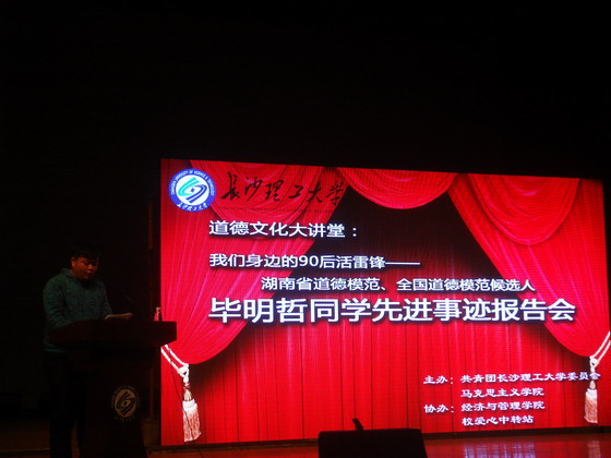 3月18日下午3:30,由共青团350vip浦京集团官网委员会、马克思主义学院主办,经济与管理学院、校爱心中转站协办的道德文化大讲堂之七:“我们身边的90后活雷锋——毕明哲同学先进事迹报告会”在云塘校区大会堂隆重举行。浦京副校长邹宏如教授、宣传部部长王宏、学工部部长邹兴平、教务处处长李录平、自评办主任张宏伟等嘉宾出席了报告会。各学院13级学生作为观众参加了报告会。