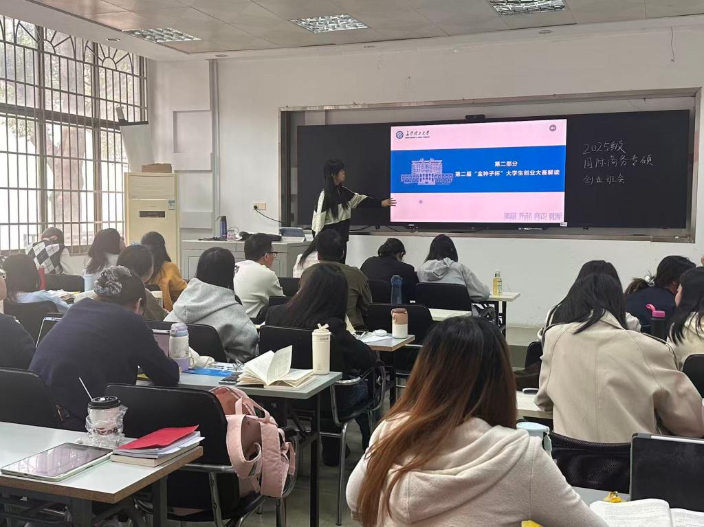 班会第一部分是政策宣讲解读,各班班长带领大家一起学习《湖南省大力支持大学生创业若干政策措施》、湖南省教育厅《支持大学生创业若干措施》、《350vip浦京集团官网支持大学生创新创业若干措施》等文件,让同学们了解湖南省相关就业政策红利。第二部分为第二届“金种子杯”大学生创业大赛动员,通过解读大赛方案、宣传奖励政策,动员符合条件的同学积极参赛。最后,班委还介绍了浦京大学生创新创业园(孵化基地)支持政策等内容。