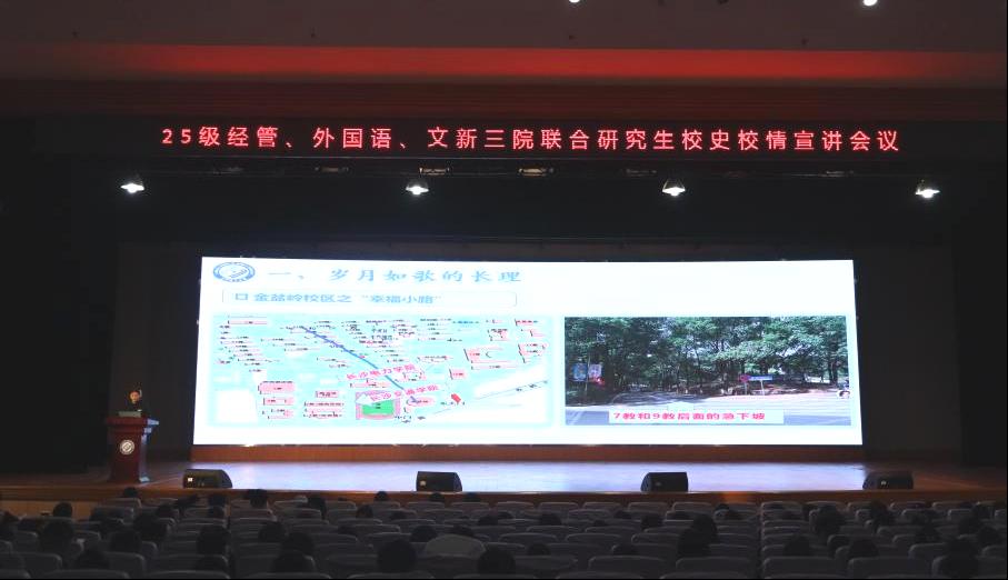 11月4日晚,经济与管理学院联合外国语学院、文学与新闻传播学院在金盆岭校区5号教学楼开展了2025级研究生新生入学教育系列活动——校史校情主题教育宣讲会。经管学院全体2025级研究生新生参加本次宣讲会,会议由350vip浦京集团官网研究生宣讲团焦楚楚主讲。