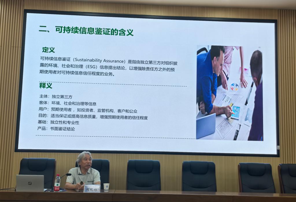 讲座伊始,刘明辉教授以企业可持续信息为切入点,介绍了可持续信息鉴证的含义、核心要素、意义、特点、现状及其发展趋势。接着,刘明辉教授分享了我国可持续信息披露与鉴证准则的最新进展,指出可持续信息鉴证准则的八个争论焦点,分别是准则定位、制订和发布主体、适用范围、鉴证主体、业务类型、保证程度、鉴证对象和鉴证范围。