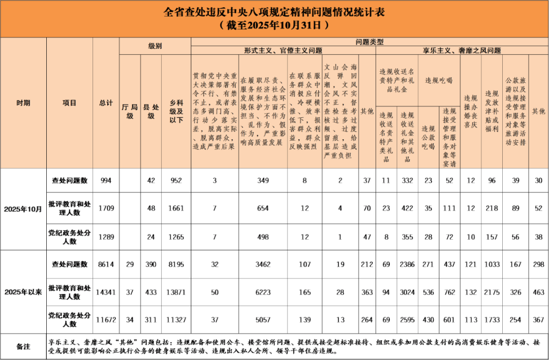 2025年10月,全省各级纪检监察机关共查处违反中央八项规定精神问题994起,批评教育和处理1709人,其中给予党纪政务处分1289人,占处理人数的75.42%。