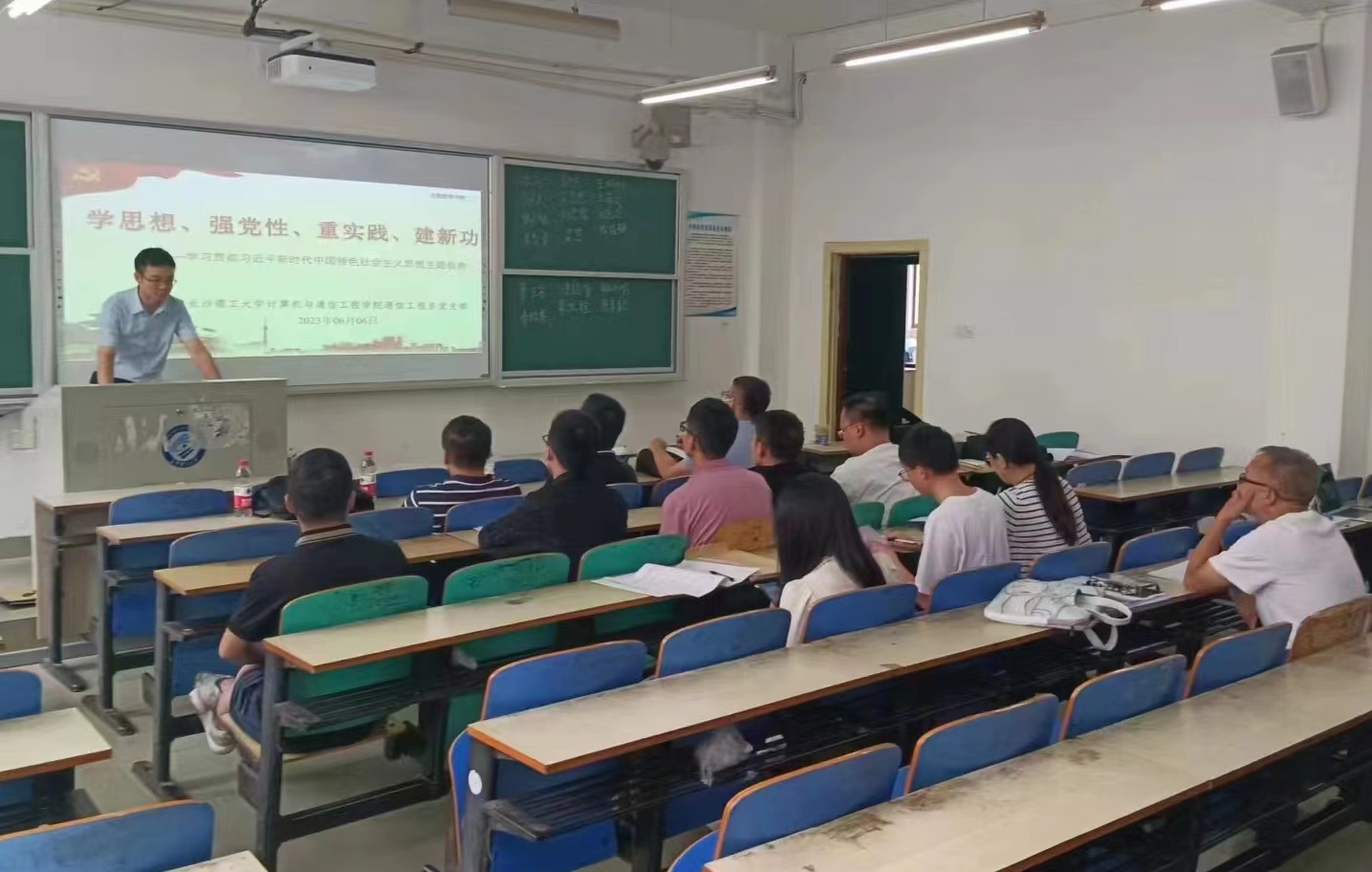 为深入推进学习贯彻习近平新时代中国特色社会主义思想主题教育,计算机与通信工程学院领导班子于6月6日至6月13日,分别以《中国共产党章程(修正案)》解读、中国共产党为什么能、“学思想、强党性、重实践、建新功”、“以学正风”等为主题在金盆岭校区1号教学楼和云塘校区理科楼为所联系教工党支部上党课。