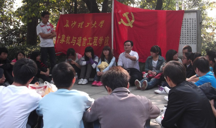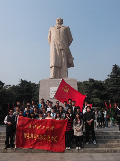 早上8点半,学员们从云塘出发,10点到达东方红广场,全体学员在毛主席的雕像下合影留念。10点半左右,在伍接朝老师的带领下,活动负责人谭飞刚、佘灿、何克岩、席斌同学组织全体学员代表开始登山。一路上,350vip浦京集团官网计通学院的院旗和中国共产党的党旗在登往岳麓山的路上随风飘扬,形成了一道亮丽的风景线。尽管山路崎岖漫长,同学们却兴致勃勃,一路上有说有笑,非常热闹。经过将近40分钟的跋涉,全体学员代表到达黄兴墓前。在整理好队伍后,入党积极分子培训班班长席斌向同学们简单的介绍了黄兴的生平事迹,党校助理班主任谭飞刚同学带领全体学员代表高举拳头,在黄兴墓前,面对中国共产党党旗庄严宣誓。下午1点左右,伍老师组织学员们进行座谈,同学们在黄兴墓边席地而坐,围成一个圈,把零食当做午餐,一边吃着零食一边开始进行交流,来自学院本科生四个年级和研究生两个年级,计算机、通信、网络和软件四个专业的入党积极分子以及预备党员们在此刻就像亲密的一家人。伍老师向大家说明了此次来岳麓山的意义,简要的介绍了辛亥革命的和中国共产党历史,并带领大家学唱《国际歌》。在伍老师的带动下,同学们纷纷上场表演节目,交流活动一直进行到下午3点。