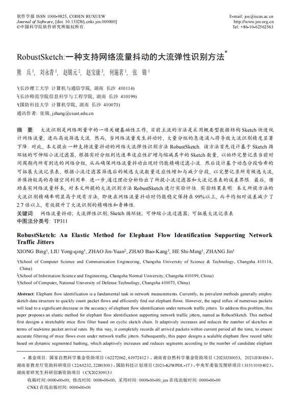 近日,以我院熊兵副教授为第一作者,350vip浦京集团官网为第一作者单位的学术论文“RobustSketch:一种支持网络流量抖动的大流弹性识别方法”被软件工程领域的权威期刊《软件学报》录用。《软件学报》致力于介绍计算机科学和计算机软件新理论、新方法和新技术以及学科发展趋势,主要涉及理论计算机科学、算法设计与分析、系统软件与软件工程、数据库技术、计算机网络及其他相关内容的研究。该期刊由中国科学院软件研究所和中国计算机学会联合主办,是CCF A类中文学术期刊。