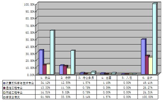 我院2012届毕业生255人,男生200人,女生50人。经摸底统计,就业、考研、考公务员、出国、入伍人数分别为158人、85人、8人、4人、0人,占年级总人数的61.96%、33.33%、3.14%、1.57%、0.00%,各专业就业意向摸底统计数据及比例分布如表1、图1示。此项工作为引导学生准确定位、认知自己,有针对性的开展就业指导活动提供了有力的参考依据。