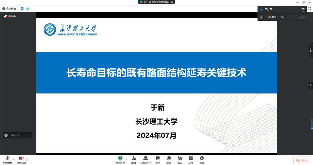 于新教授围绕“长寿命目标的既有路面结构延寿关键技术”详细介绍了既有沥青路面结构力学行为及性能衰减规律、复杂环境条件下既有沥青路面结构延寿机制与延寿设计方法两大关键科学问题。通过自己主持的国家重点科研项目着重介绍了旧路评价与诊断、性能分析与预测、延寿理论与方法、配套设计与研发四大关键技术解决方案,为学员们提供了一个由浅入深、从理论到实践的全方位学习体验。于教授表示长寿命目标的既有路面结构延寿还面临诸多理论和技术难题,他鼓励对该方向有兴趣的师生开展积极深入的研究。