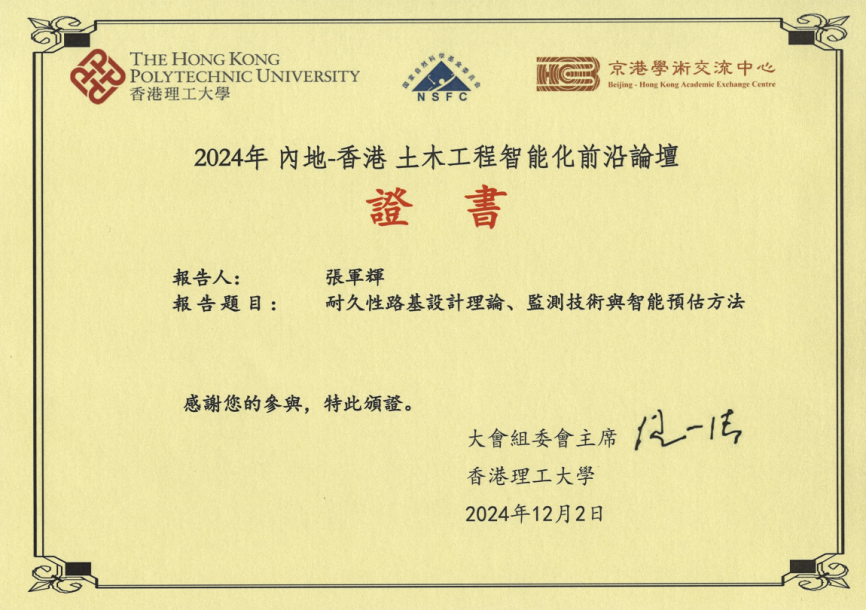 为进一步促进内地和香港高校科技交流合作,近日,浦京张军辉副校长一行参加由国家自然科学基金委员会资助、香港理工大学举办的主题为“土木工程智能化”前沿论坛,并作了题为“耐久性路基设计理论、智慧监测技术与智能预估方法”的交流汇报,交通运输工程学院教师高峰、彭俊辉参加了本次论坛。