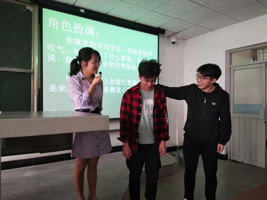 首先,汪招霞老师进行了自我介绍,讲解了朋辈心理培训的主要内容,通过几个真实的心理辅导案例来向同学们具体阐述培训的重要性,教导我们要学会“自助、互助、求助”,发现问题及时上报辅导员。随后,汪招霞老师向同学们介绍了三个求助途径。接着,又通过让同学进行角色扮演,使我们更加深入的了解遇到问题我们要如何运用心理学技巧妥善解决。培训最后,汪招霞老师通过播放短片,加深同学们对朋辈互助员职责的理解。