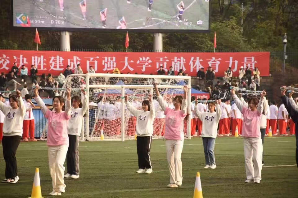 初晨的宁静被橘红色的光幕悄然打破,云霞里升起一条红色的弧线。开幕式开始,交通学院学生参与的团体操表演展现在大家眼前,音乐在跳动,青春在飞扬,他们旋转,跳跃,手中折扇翻飞,舞步翩然,观众的视线聚集在他们身上,奔跑与跃动之间,观众热情高涨、呼声不断,点燃了现场氛围。